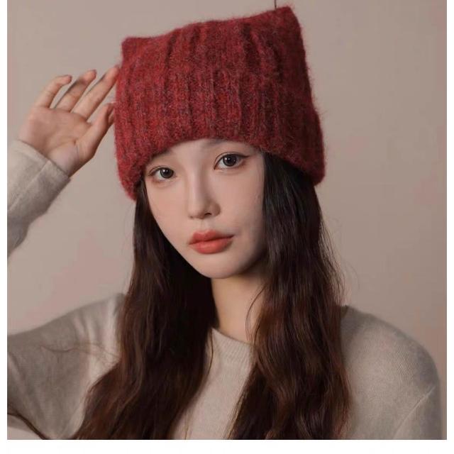韓國新款可愛貓耳朵軟毛絨針織帽冷帽毛綫帽子女時尚百搭包頭帽潮