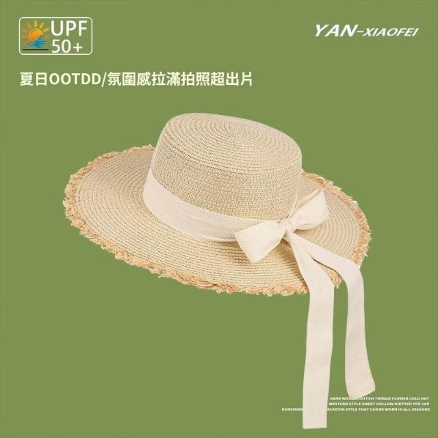 新款法式蝴蝶結夏季女大帽檐遮陽草帽海邊度假防曬草帽子拍照神器