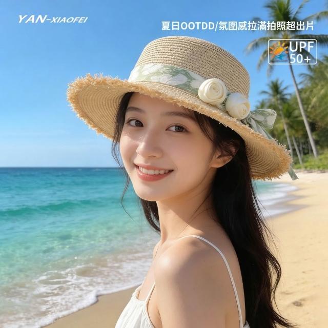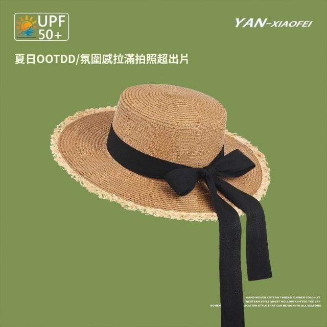 新款法式蝴蝶結夏季女大帽檐遮陽草帽海邊度假防曬草帽子拍照神器