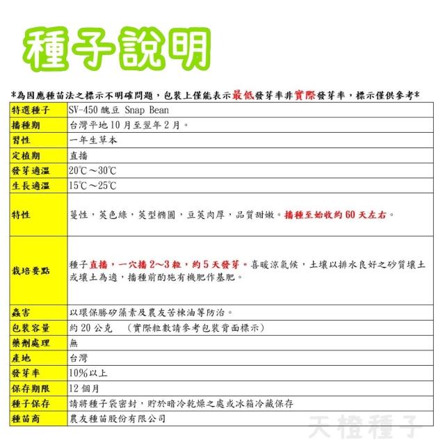 天橙種子醜豆種子 SV-450 約20公克 特選種子 豆類 農友種苗 彩色原包裝