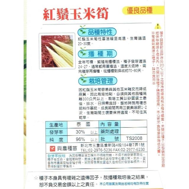 天橙種子紅鬚玉米筍種子 8公克(約70粒) 全年可播種 非基因改造 蔬果種子 根莖類 興農種苗 彩色原包裝