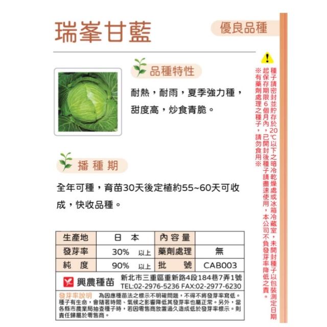 天橙種子瑞峰甘藍種子 高麗菜 1公克(約200粒) 全年可播種 耐熱.耐雨 結球類 興農種苗 彩色原包裝