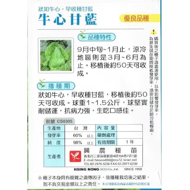 天橙種子牛心甘藍種子 高麗菜 1公克 9~1月播種 早收品種 結球類種子 興農種苗 家庭園藝 彩色原包裝
