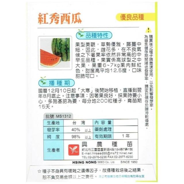 天橙種子紅秀西瓜種子 紅肉西瓜 1公克 雌花多 瓜果類 興農種苗 彩色原包裝