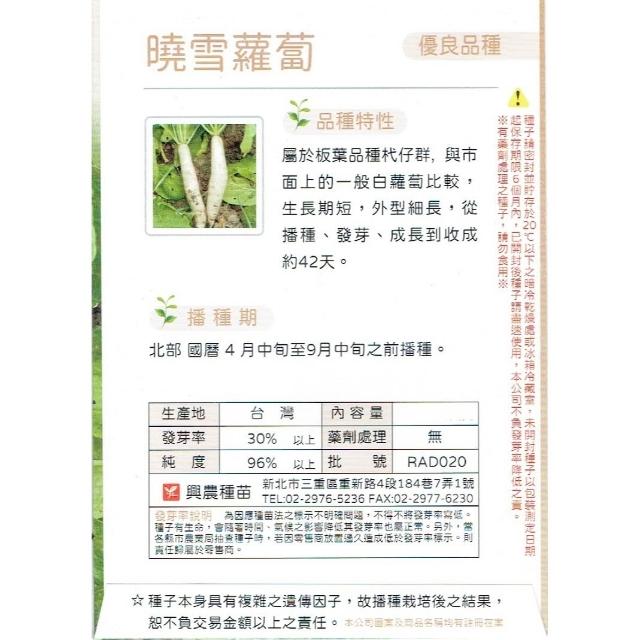 天橙種子曉雪蘿蔔種子 白蘿蔔 約5公克 4~9月播種 板葉品種 根莖類種子 興農種苗 家庭園藝 彩色原包裝