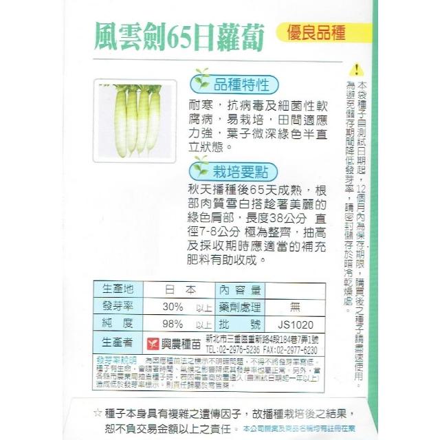 天橙種子風雲劍65日蘿蔔種子 白蘿蔔種子 3公克 耐寒 抗病毒 秋天播種 根莖類種子 興農種苗 彩色原包裝