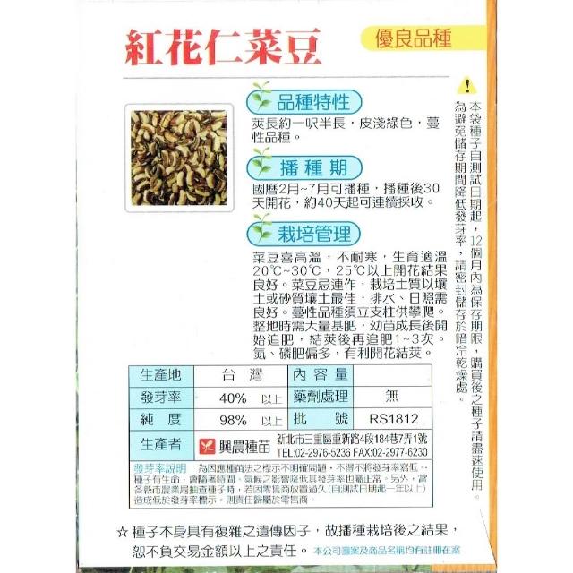 天橙種子紅花仁菜豆種子 蔓性菜豆 5公克(約30粒) 2~7月播種 豆類種子 興農種苗 家庭園藝 彩色原包裝