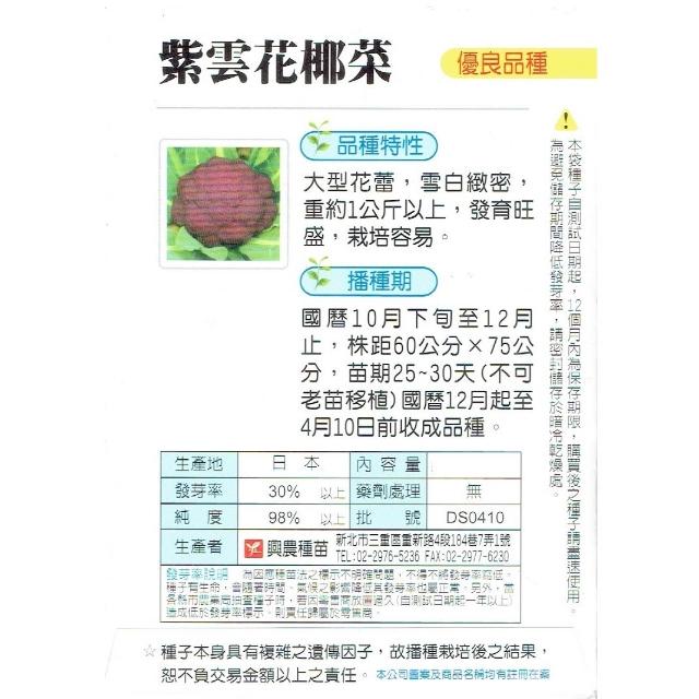 天橙種子紫雲花椰菜種子 紫色花椰菜 約70粒 10~12月播種 結球類種子 興農種苗 家庭園藝 彩色原包裝