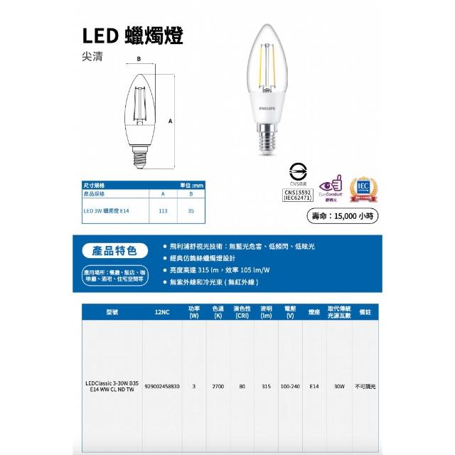 Philips 飛利浦飛利浦 PHILIPS LED E14 尖清 蠟燭燈 3W 黃光 仿鎢絲 全電壓 燈后