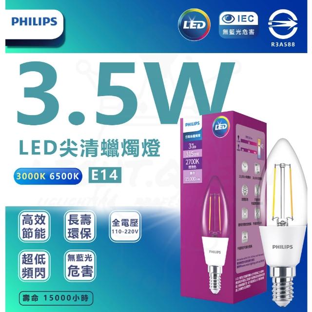 Philips 飛利浦飛利浦 PHILIPS LED E14 尖清 蠟燭燈 3W 黃光 仿鎢絲 全電壓 燈后