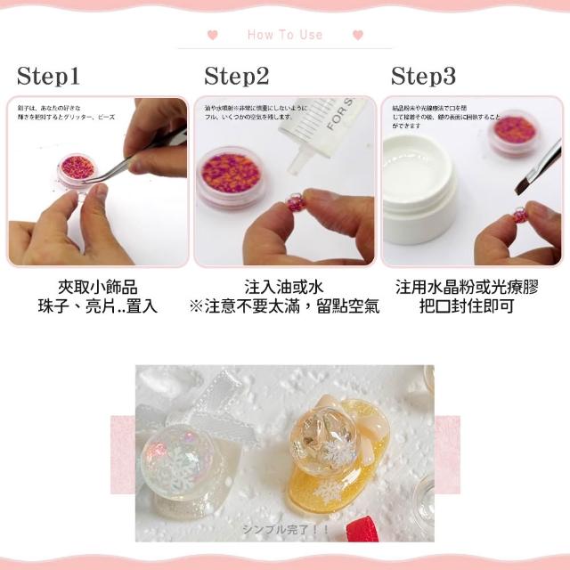 - 注入乾燥花、亮片再加水封住