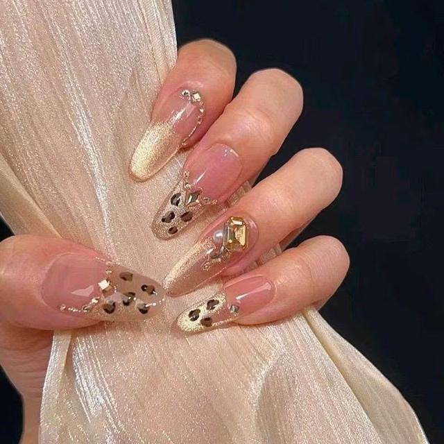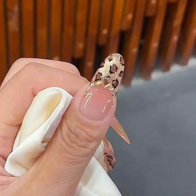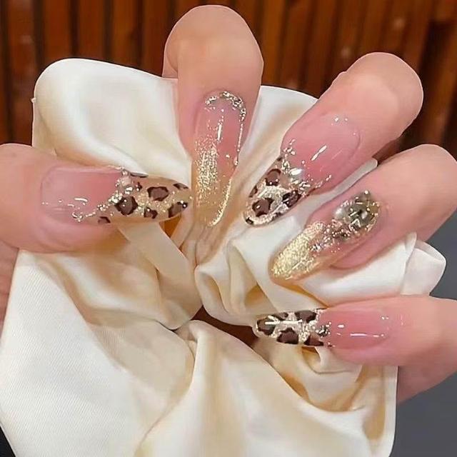 新款美拉德金棕漸變豹紋美甲香檳白純手工穿戴甲辣妹美甲