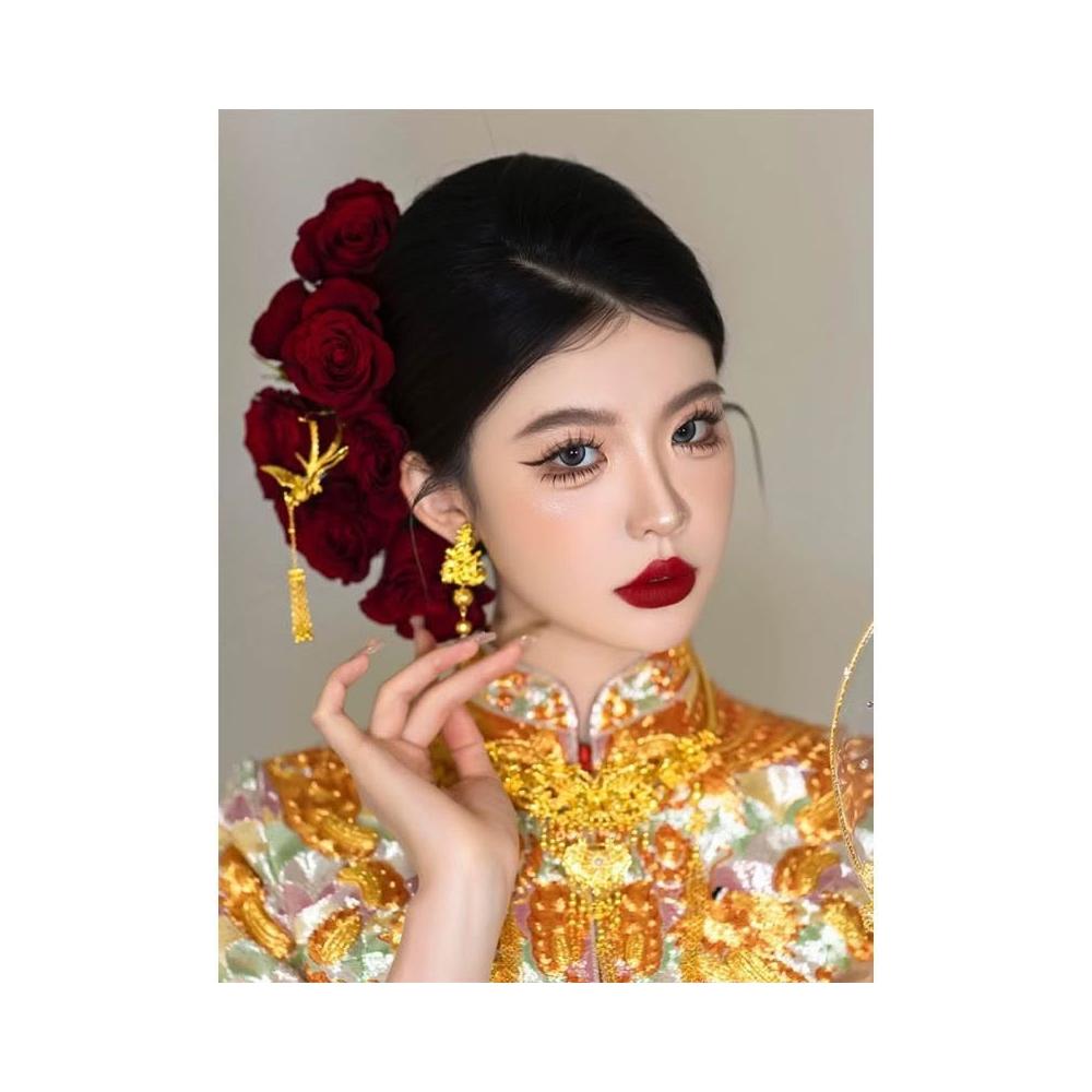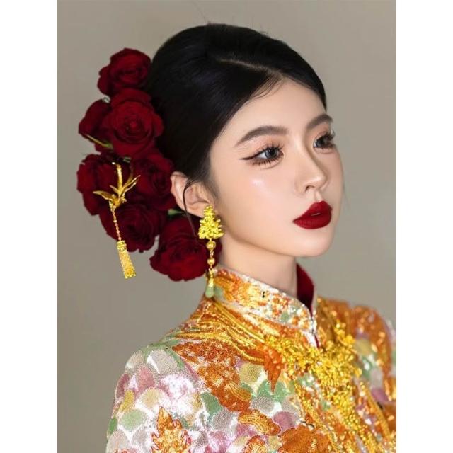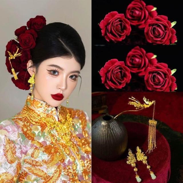 新娘紅玫瑰髮簪套裝紅色中式秀禾髮飾花朵盤髮結婚配飾品