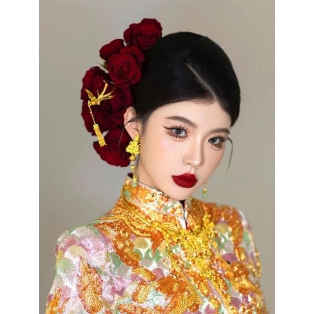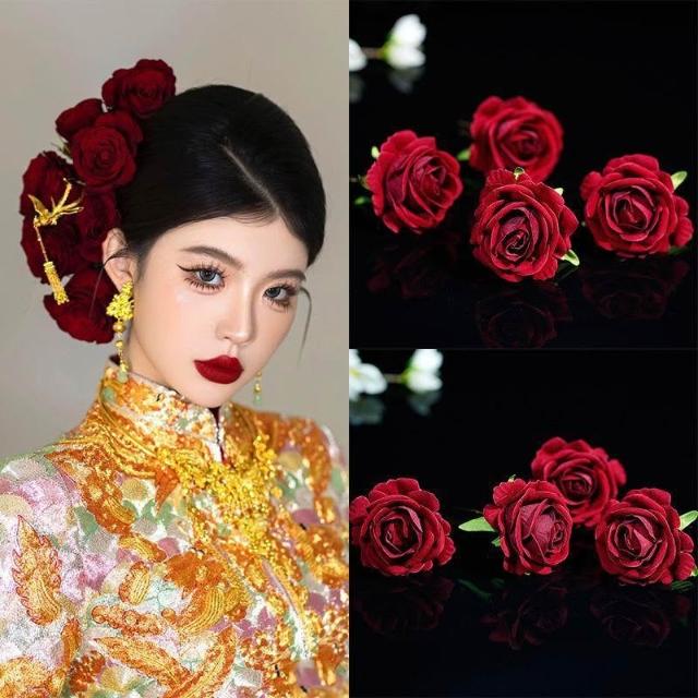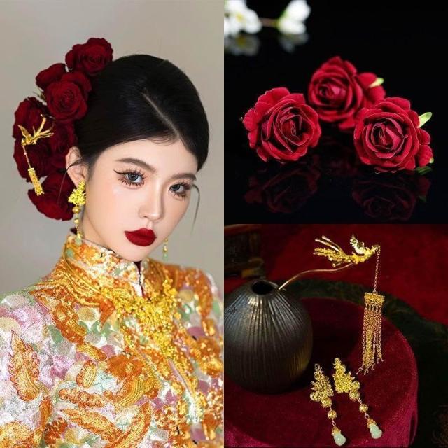 新娘紅玫瑰髮簪套裝紅色中式秀禾髮飾花朵盤髮結婚配飾品