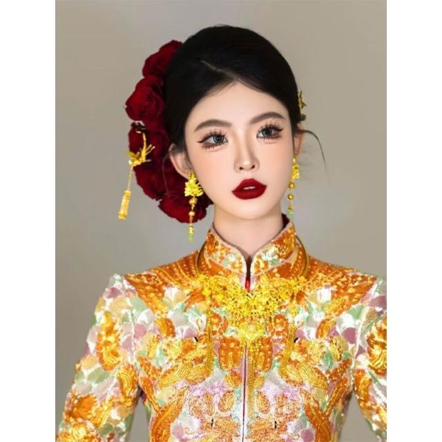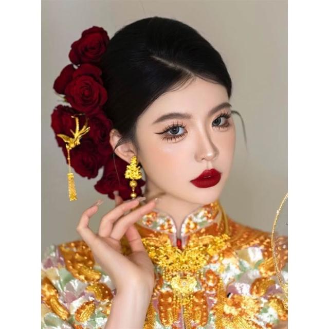 新娘紅玫瑰髮簪套裝紅色中式秀禾髮飾花朵盤髮結婚配飾品