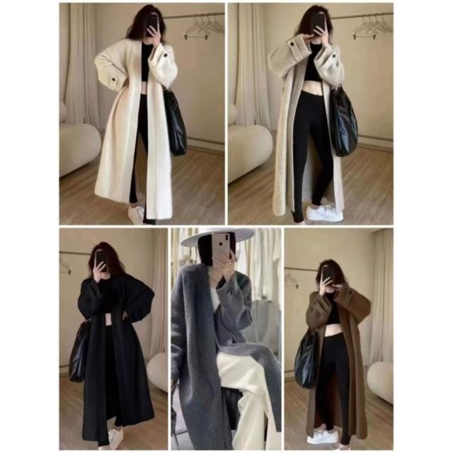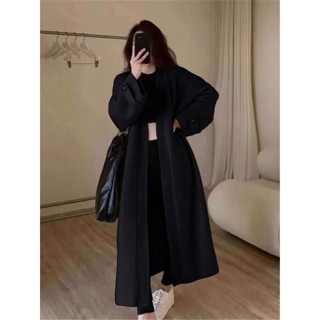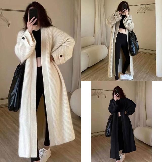 針織外套女中長版春秋冬季新款仿羊毛衣麻花開衫長袖上衣罩衫寬鬆休閒設計感外披輕薄舒適V領毛呢大衣保暖純色修身洋裝小外套