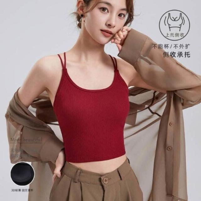 背心女款夏季運動小吊帶外穿夏內搭帶胸墊美背文胸一體式打底瑜伽上衣舒適修身親膚透氣女裝內衣無痕帶胸墊純棉美背打底方領上衣