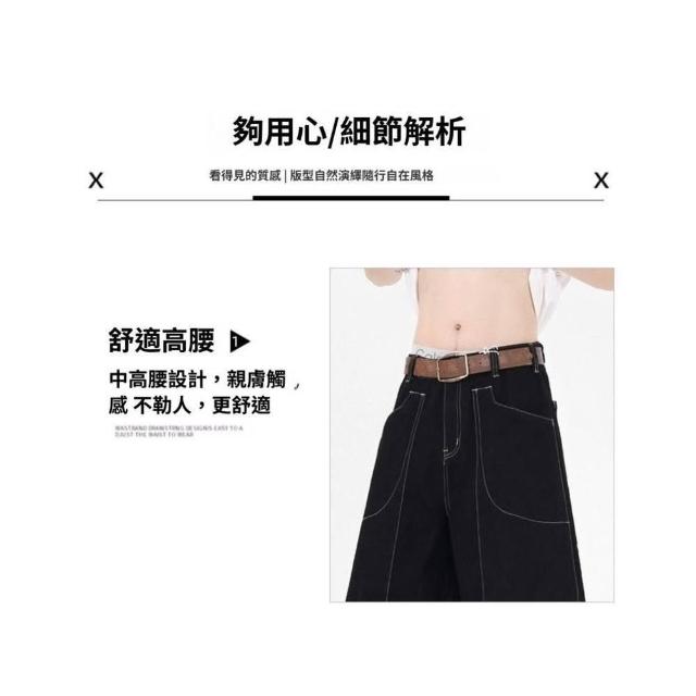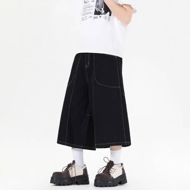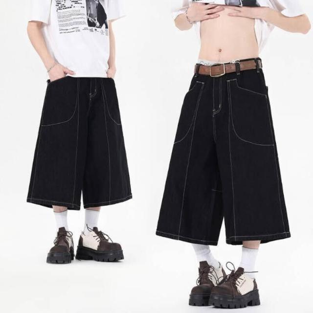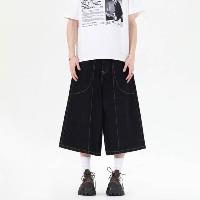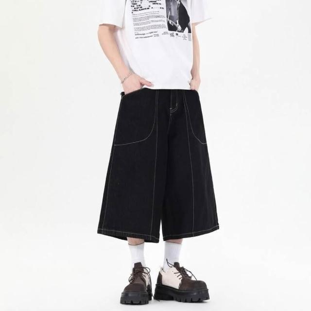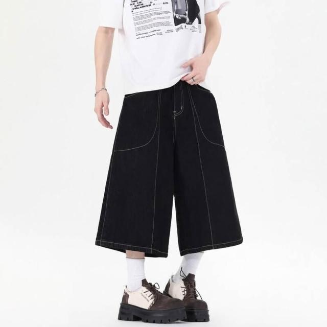 牛仔褲短褲男美式高街夏天運動薄短褲跑步休閒短褲七分褲黑色明線寬褲工作透氣直筒男短褲七分短褲青年柔軟舒適闊腿中褲男士褲子男