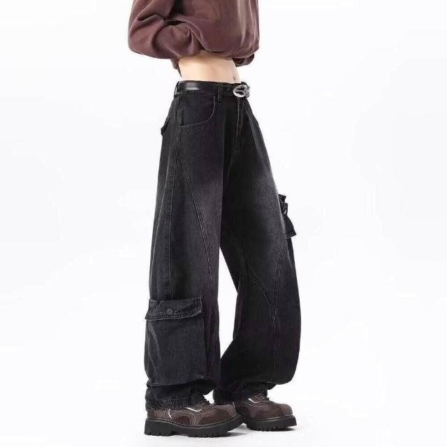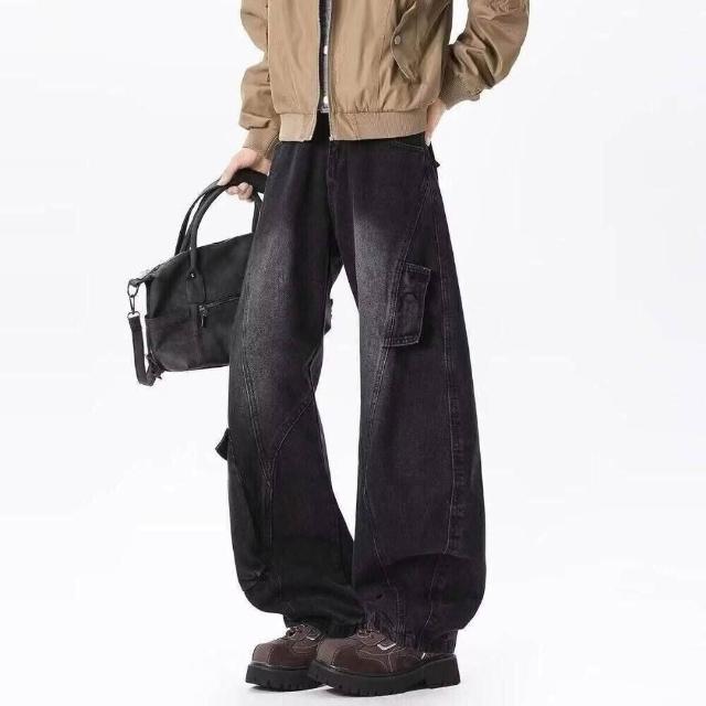 彎刀褲 寬松直筒牛仔褲男士秋季新款復古做舊多口袋工裝褲闊腿長褲工裝褲低腰水洗機能寬褲大尺碼薄休閒褲耐磨登山褲春秋冬垂感韓國彎刀褲