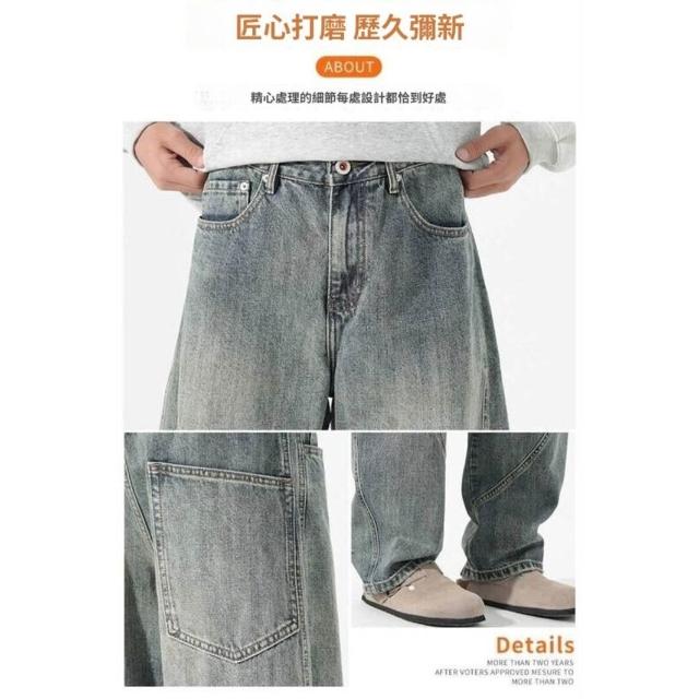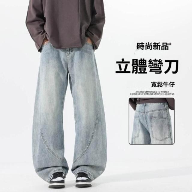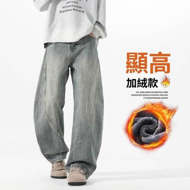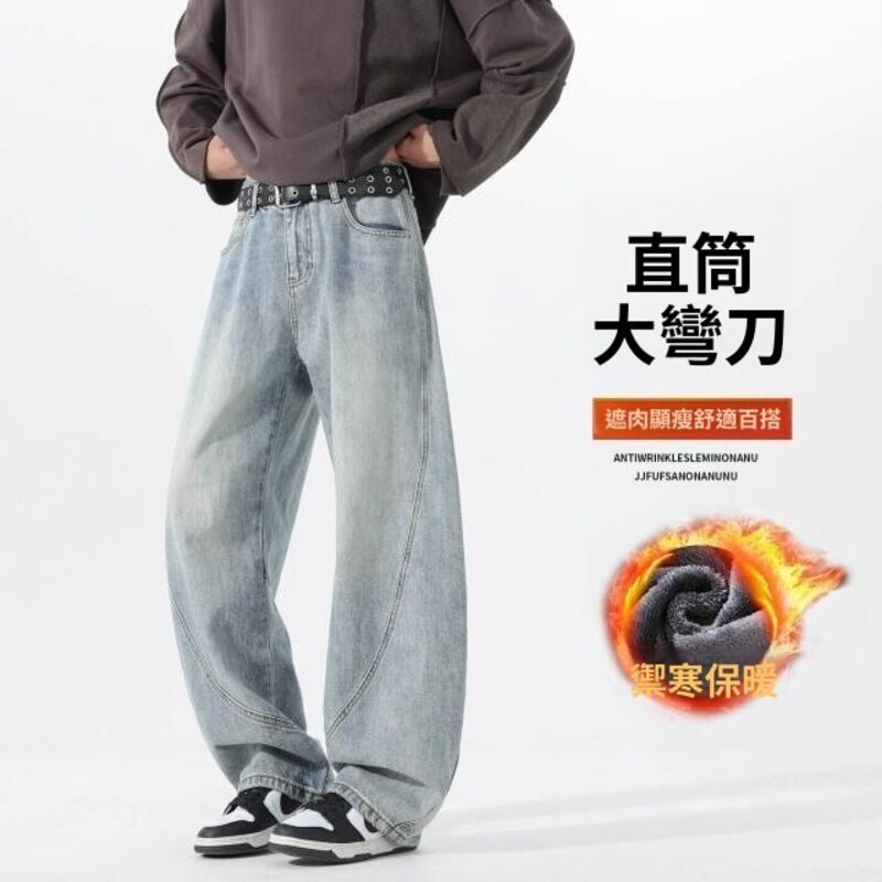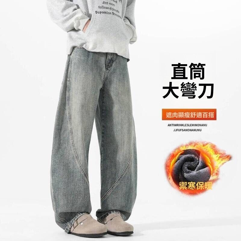 牛仔褲刷毛休閒工作彎刀防風保暖工裝登山運動長褲男女秋冬內磨毛闊腿加絨厚磅寬褲高腰直筒寬鬆發熱棉褲垂感水洗加厚堆堆褲男牛仔
