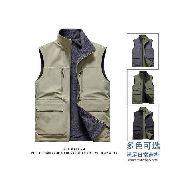 背心男春秋季中青年雙面穿多口袋工裝立領外套無坎肩寬鬆抓絨背心修身運動上衣男裝透氣跑步休閑健身運動外套彈性T恤柔軟簡約工作通勤無袖休閒外套