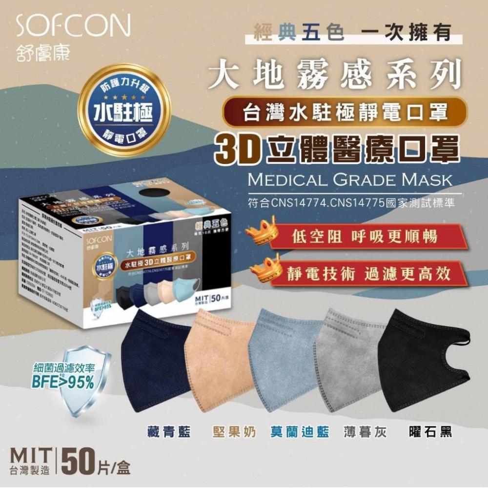舒膚康 水駐極 3D立體醫療口罩 50入/盒 大地霧感 靜電口罩 3D口罩 醫用口罩
