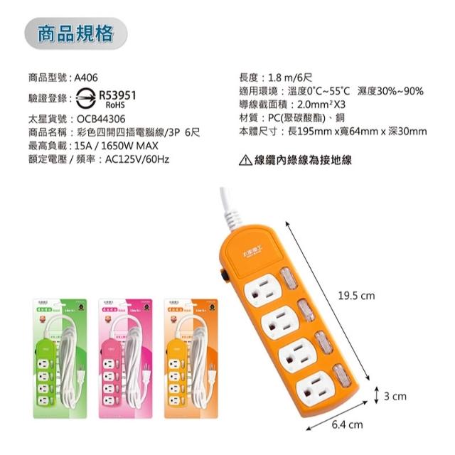 太星電工彩色多開多插電腦線/3P15A 6尺/9尺 三開三插 四開四插 六開六插 OCB