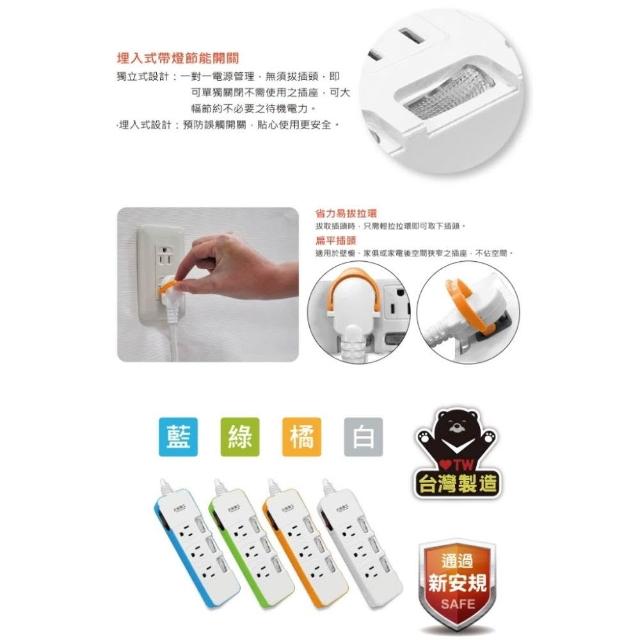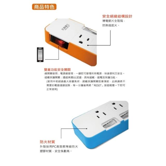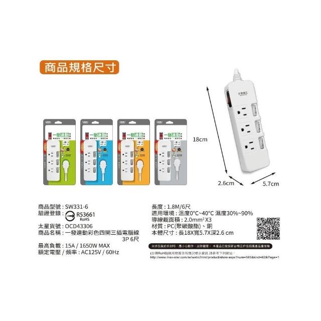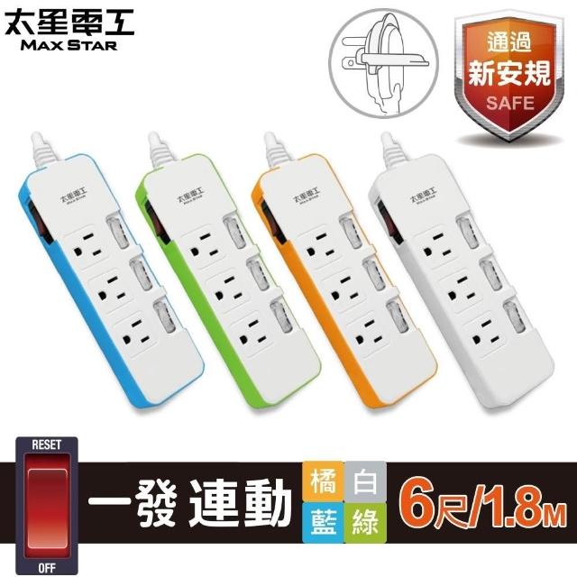 太星電工一發連動彩色四開三插電腦線/3P 6尺(白/藍/綠/橘色) OCD43306
