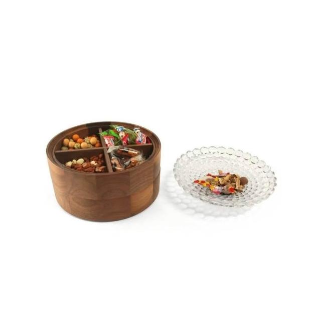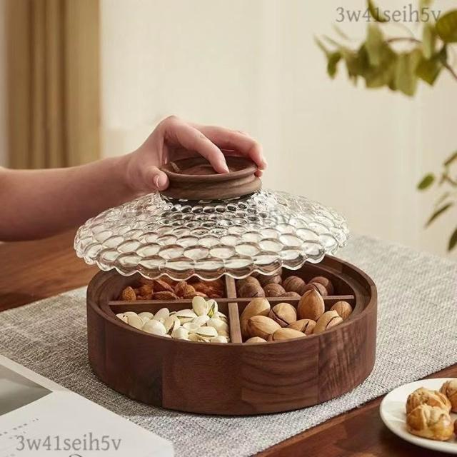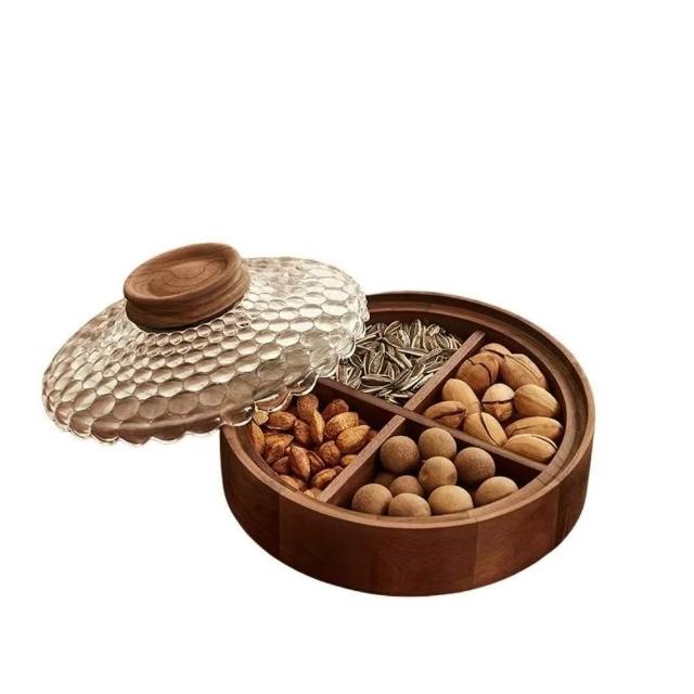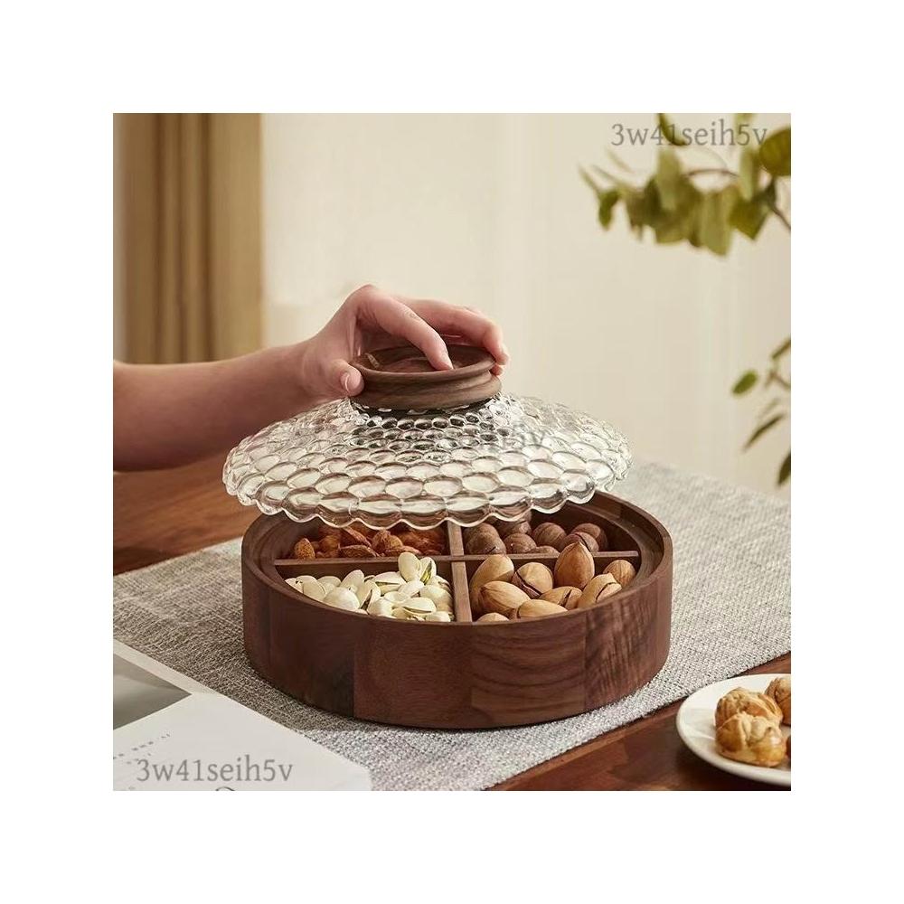 新中式胡桃木乾果盒 分格可疊加高檔茶點果盤 玻璃水果盤 帶蓋乾果盒糖果盒 茶點零食盤實木餐盤 茶盤
