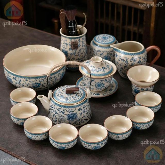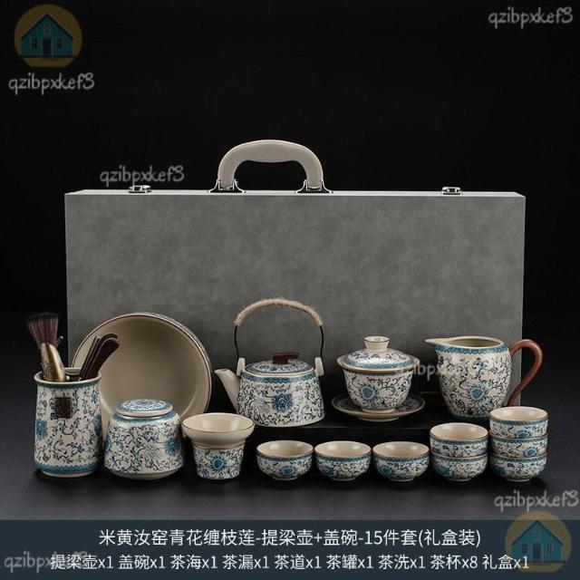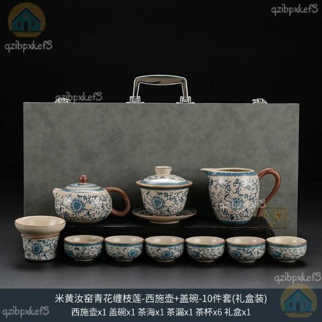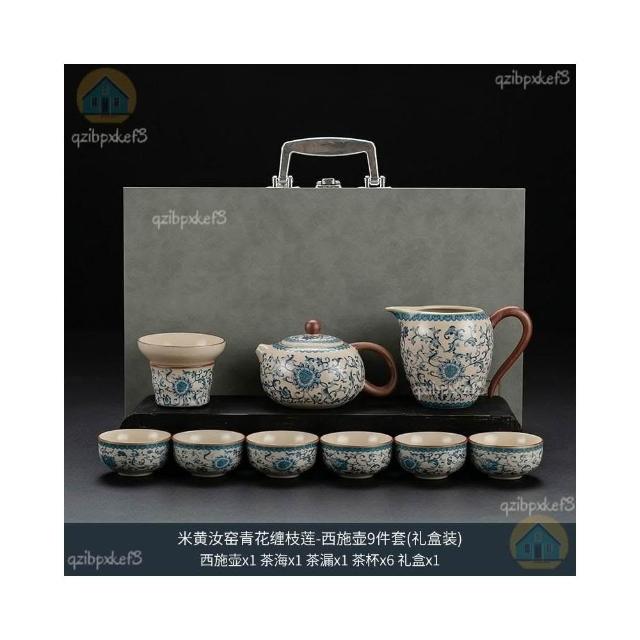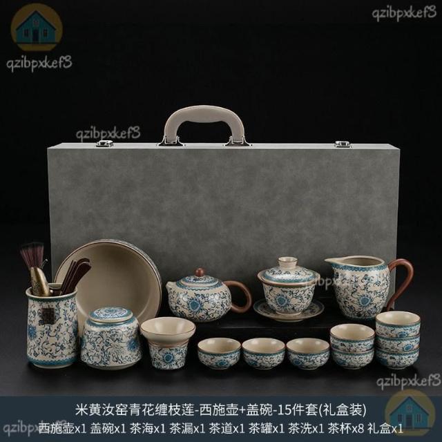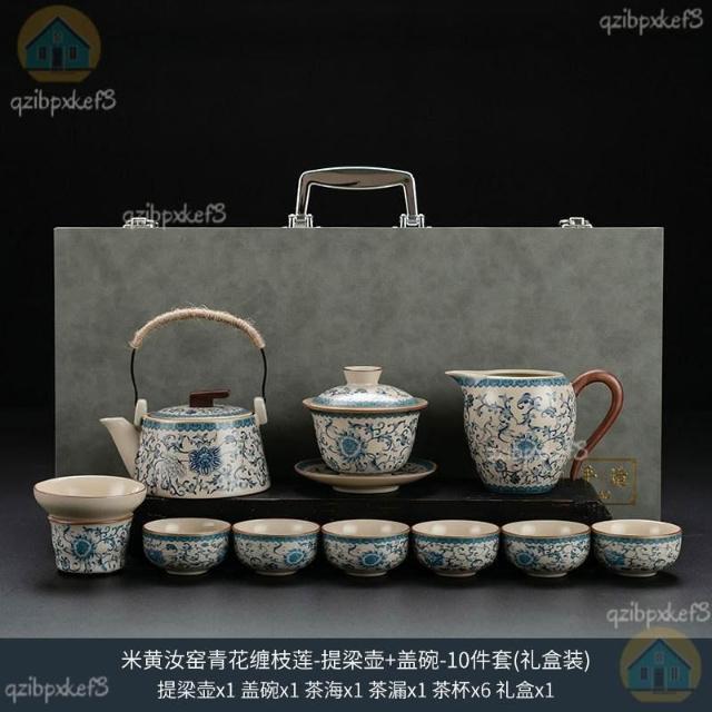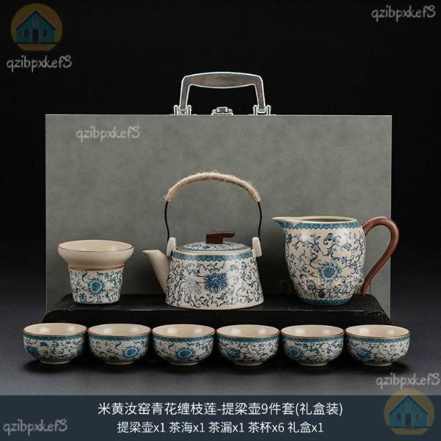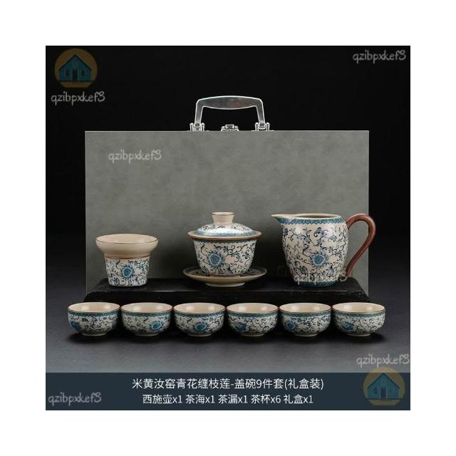 附發票🔈米色汝窯功夫茶具 青花纏枝蓮釉上彩提壺蓋碗整套泡茶器中式陶瓷 整套功夫茶具