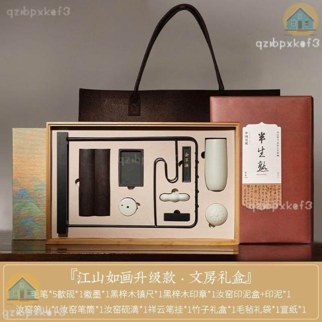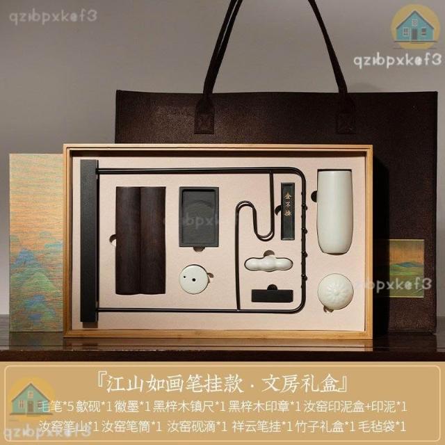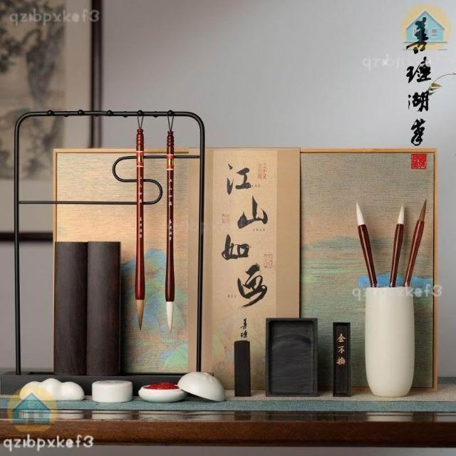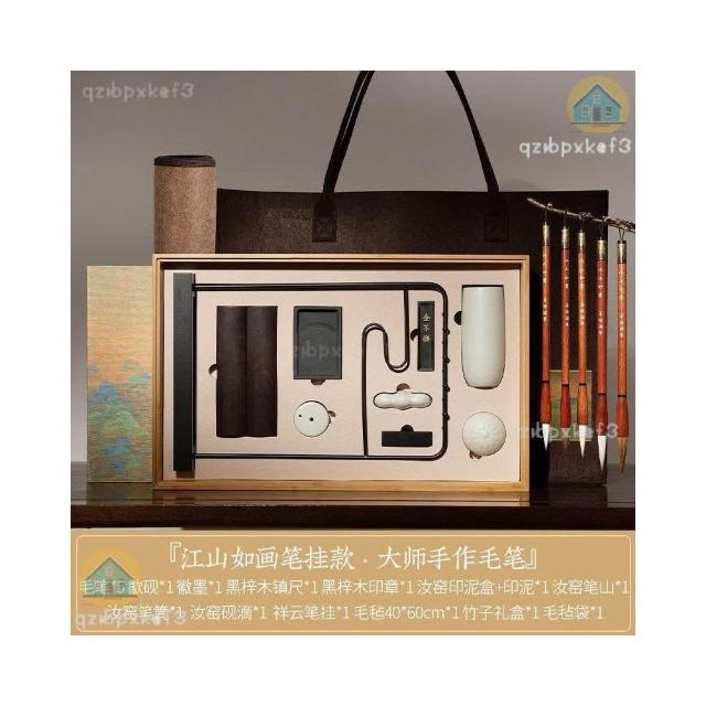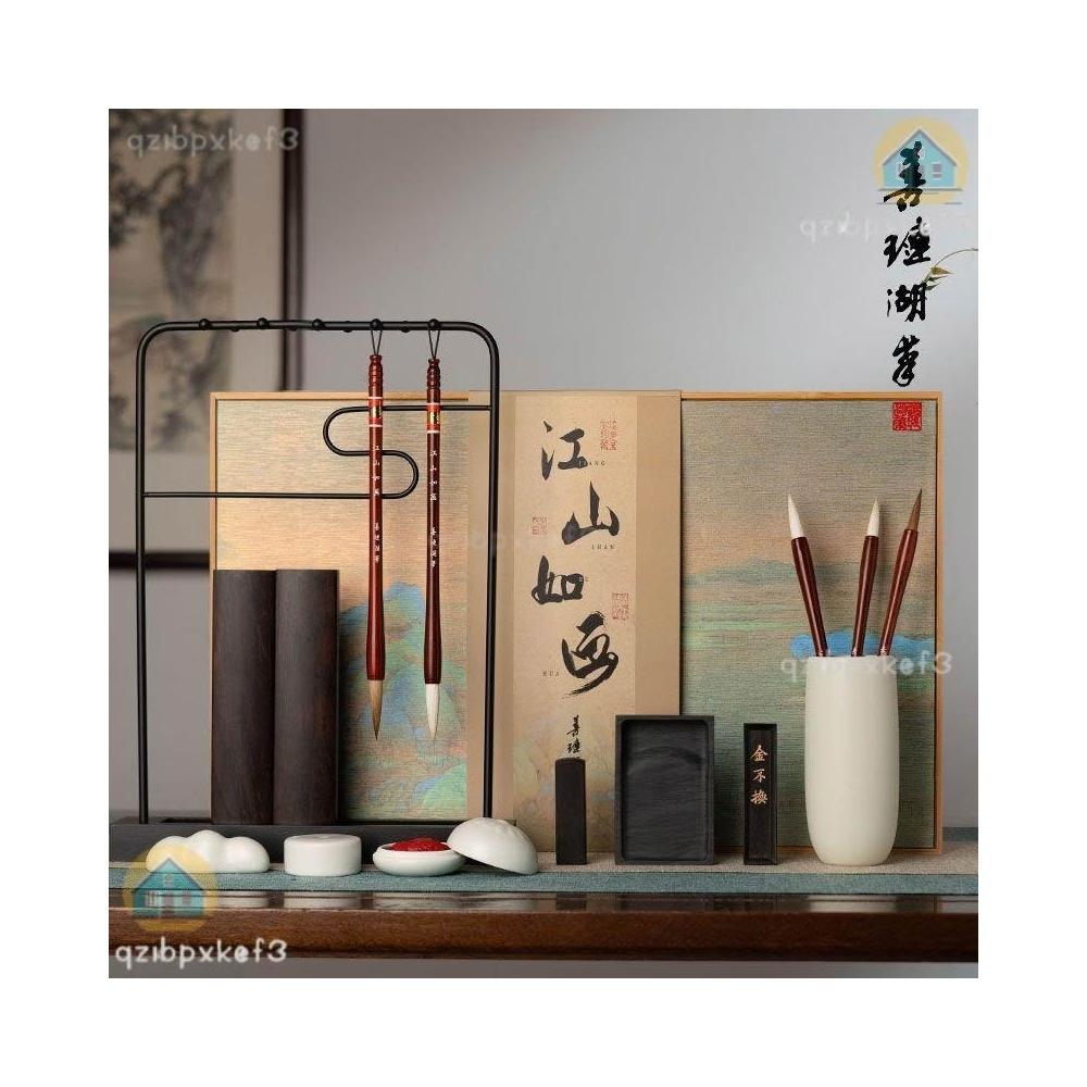 文房四寶全套 一整套禮盒 毛筆高檔禮盒 專業級筆墨紙硯 書法送禮 兼毫聚鋒湖筆 中楷 一整套掛筆架