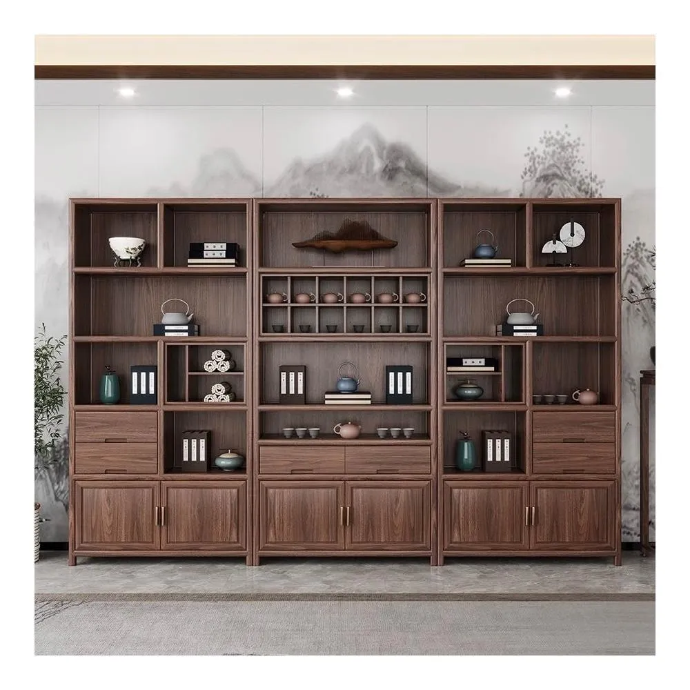新中式博古架實木書櫃黑胡桃木展示櫃老榆木置物架收納櫃茶室傢俱