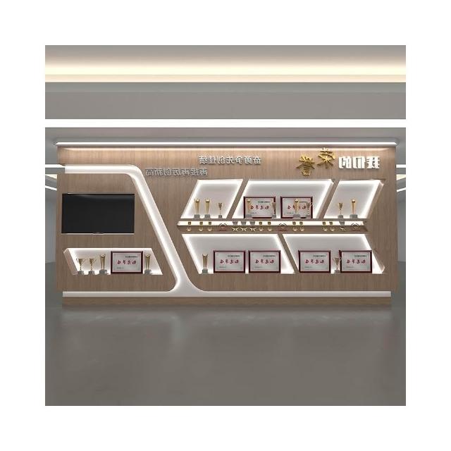 定制公司展廳獎盃榮譽牆展示櫃企業形象牆背景高櫃弧形木紋展櫃燈