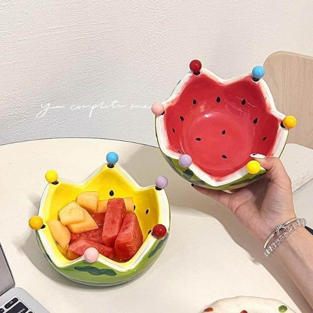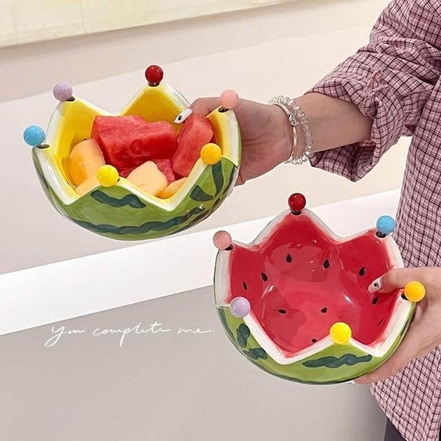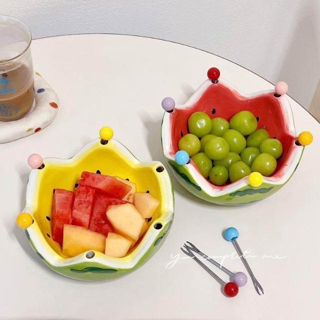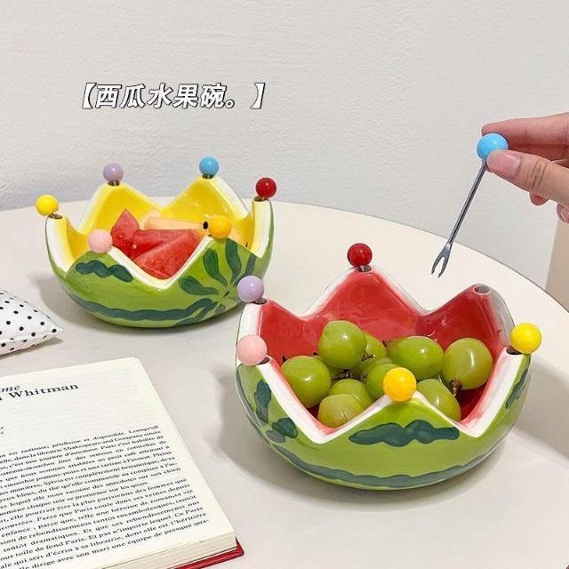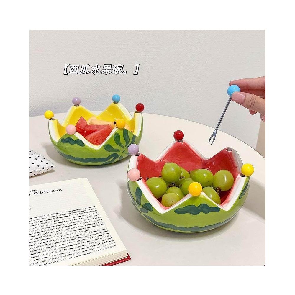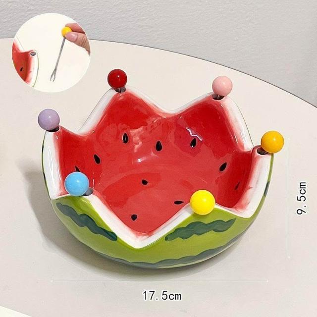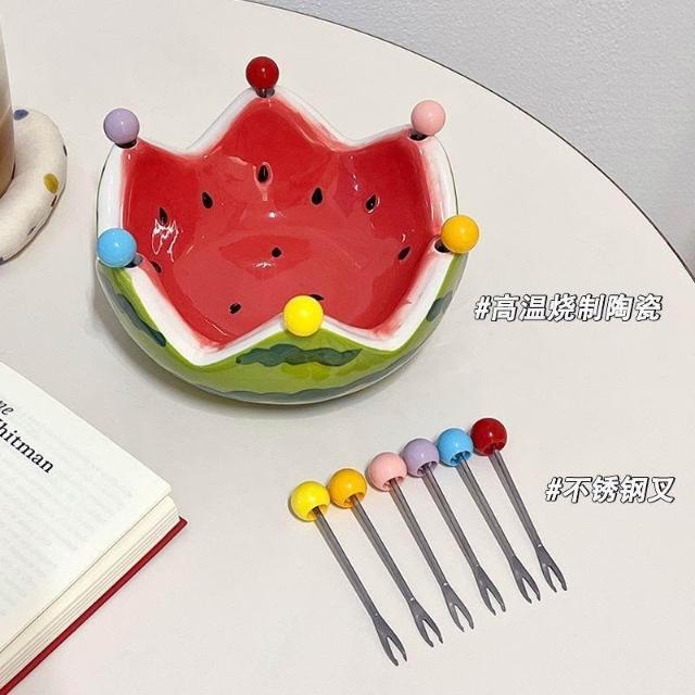 免運+新品推薦可愛西瓜陶瓷碗創意不鏽鋼叉子水果沙拉碗宿舍家用大容量水果盤