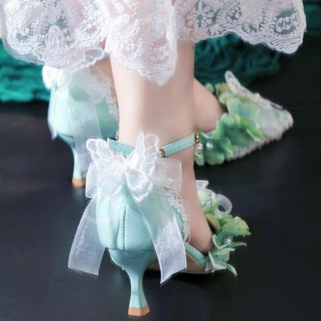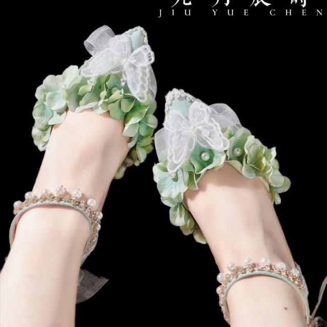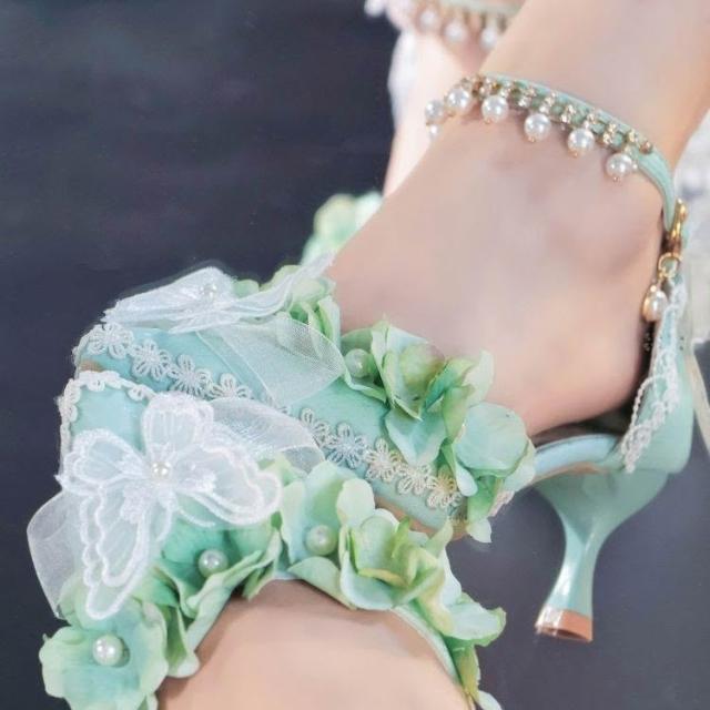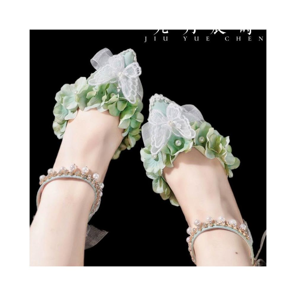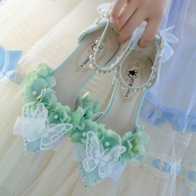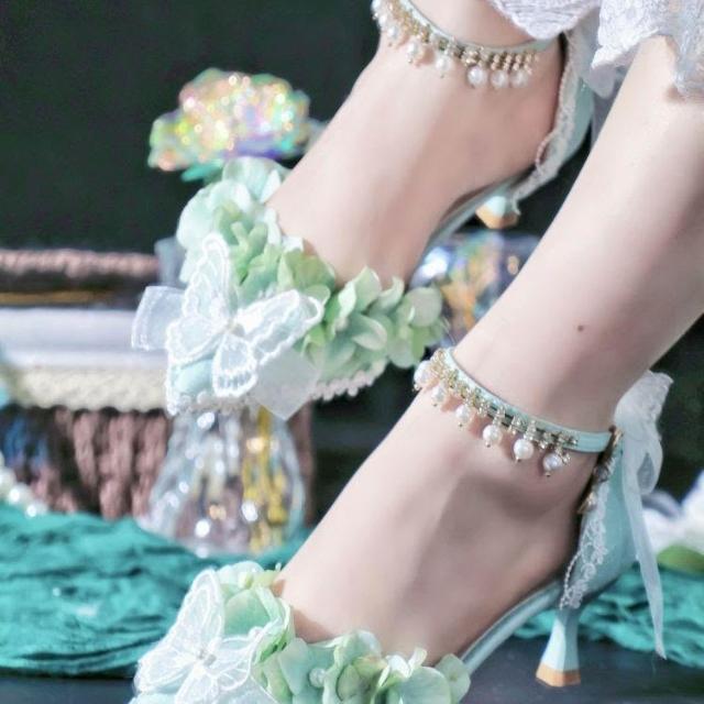 免運+新品推薦洛麗塔花嫁高跟鞋綠色珍珠蝴蝶結手工定製女鞋公主風氣質lo鞋超仙