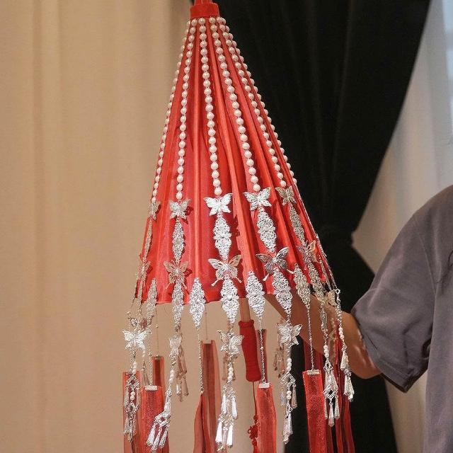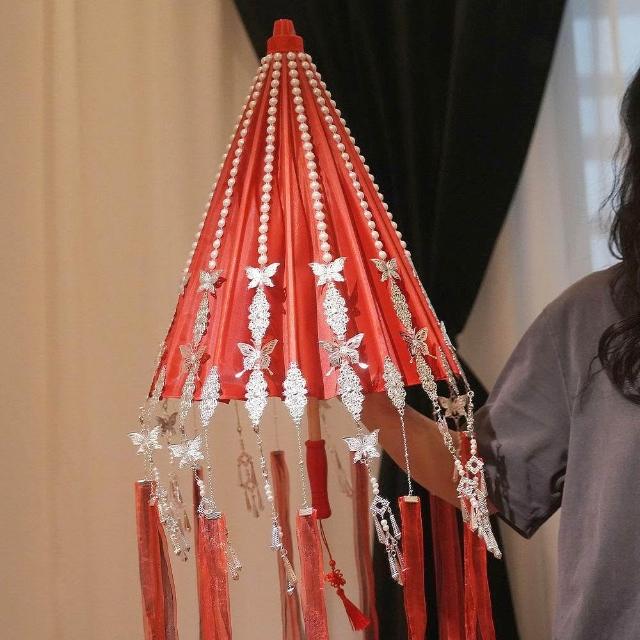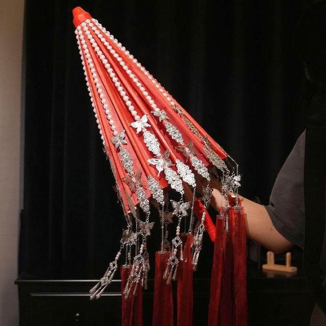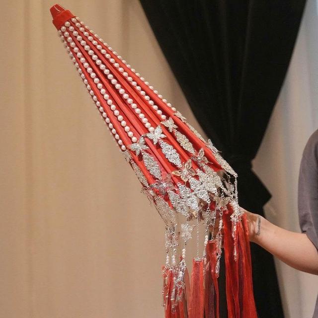 免運+新品推薦古風漢服傘花城COS銀蝶傘華麗飄帶紅色傘拍照道具漫展鈴鐺傘定做