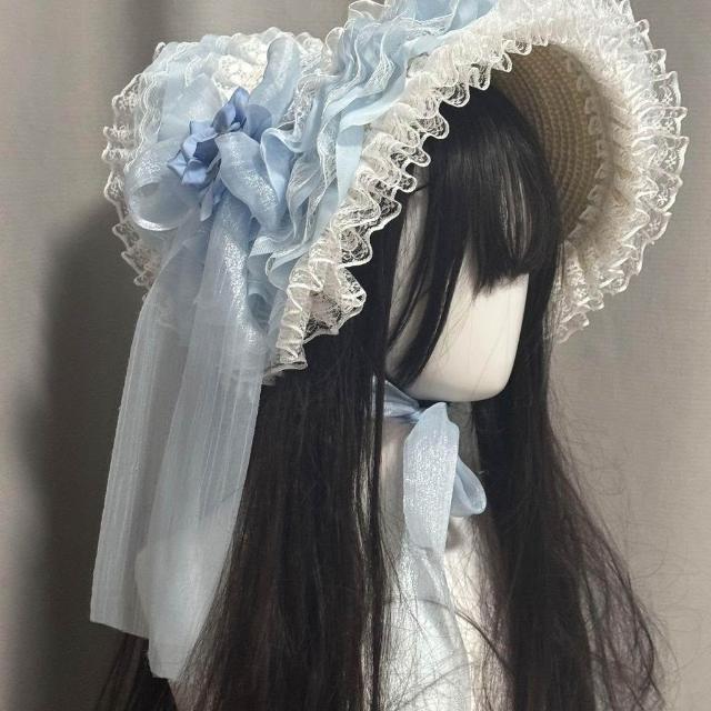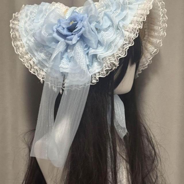 免運+新品推薦【定製】原創洛麗塔田園風蕾絲田園花帽藍色女童髮飾華麗拍照雙面