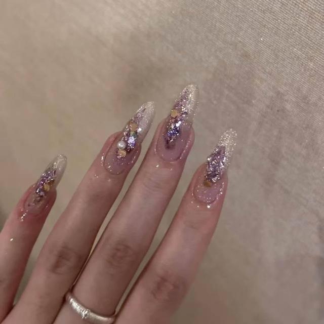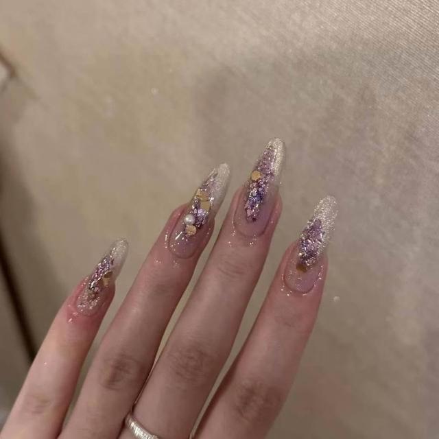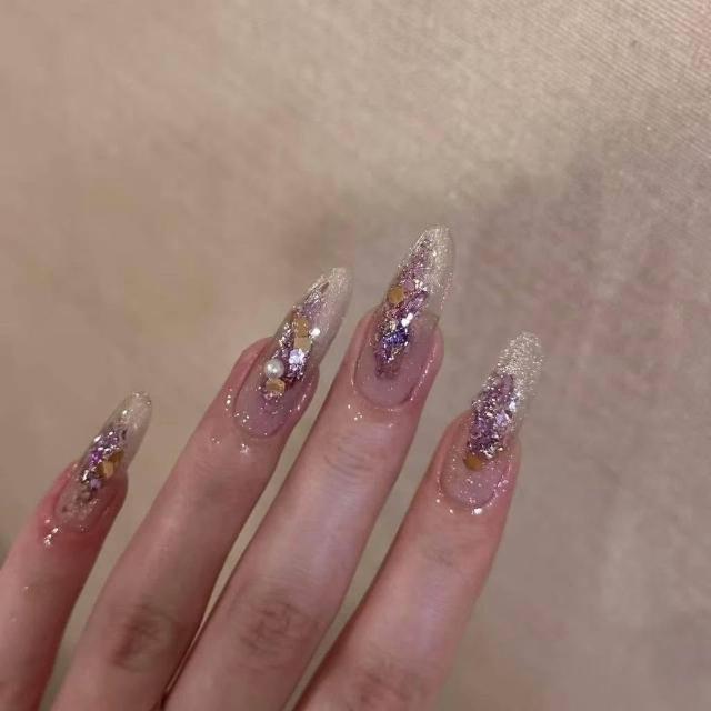 免運+新品推薦紫色珍珠亮片漸變貓眼美甲秋冬顯白純欲千金高級感精緻重工穿戴甲