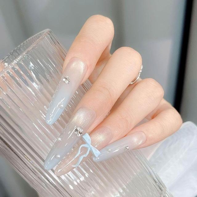 免運+新品推薦T.手工定製甲片拆卸穿戴假指甲光療冰透貓眼奶藍色漸變蝴蝶結美甲
