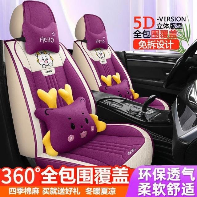 博博精品 潮款汽車坐墊 車內坐墊全套 夏季亞麻布藝 座套卡通 四季通用 座椅墊 透氣舒適防滑耐磨 安裝簡易車用必備