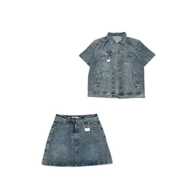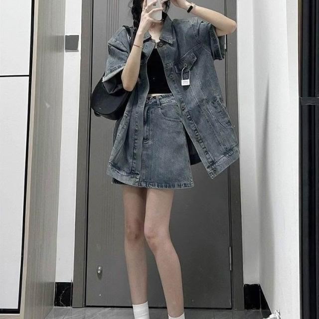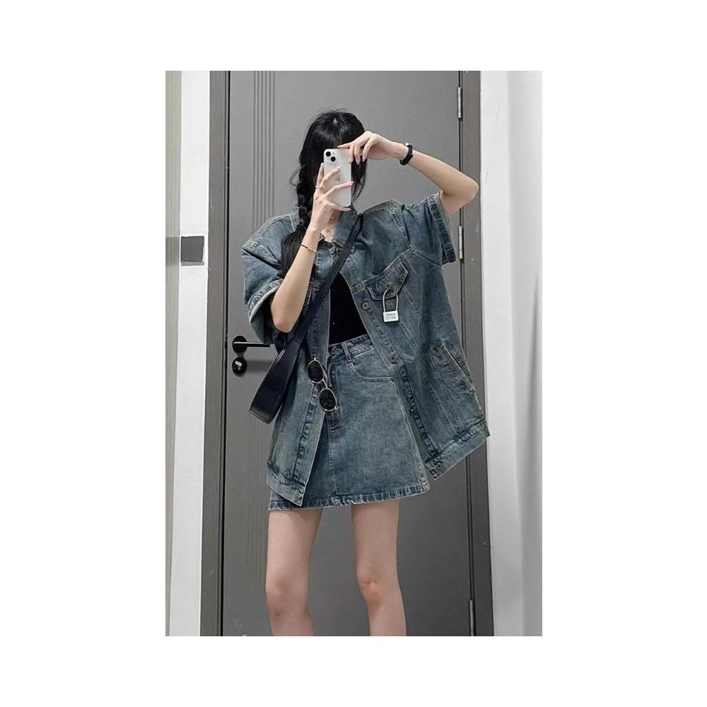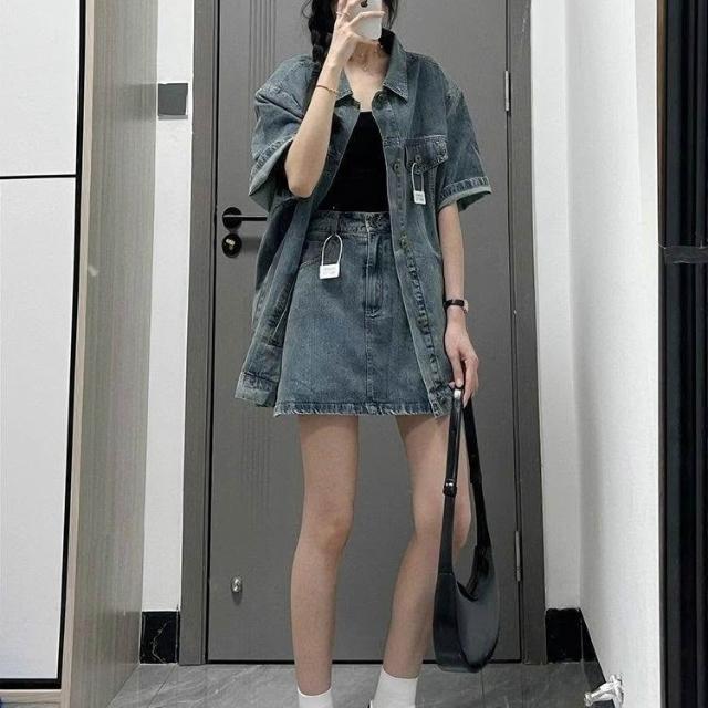 博博精品 美式復古套裝女 夏季新款 高級感 寬鬆顯瘦 牛仔襯衫 半身短裙子 兩件套 時尚百搭 日常休閒 穿搭必備