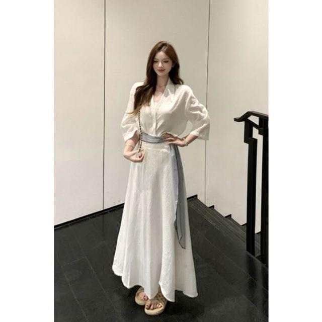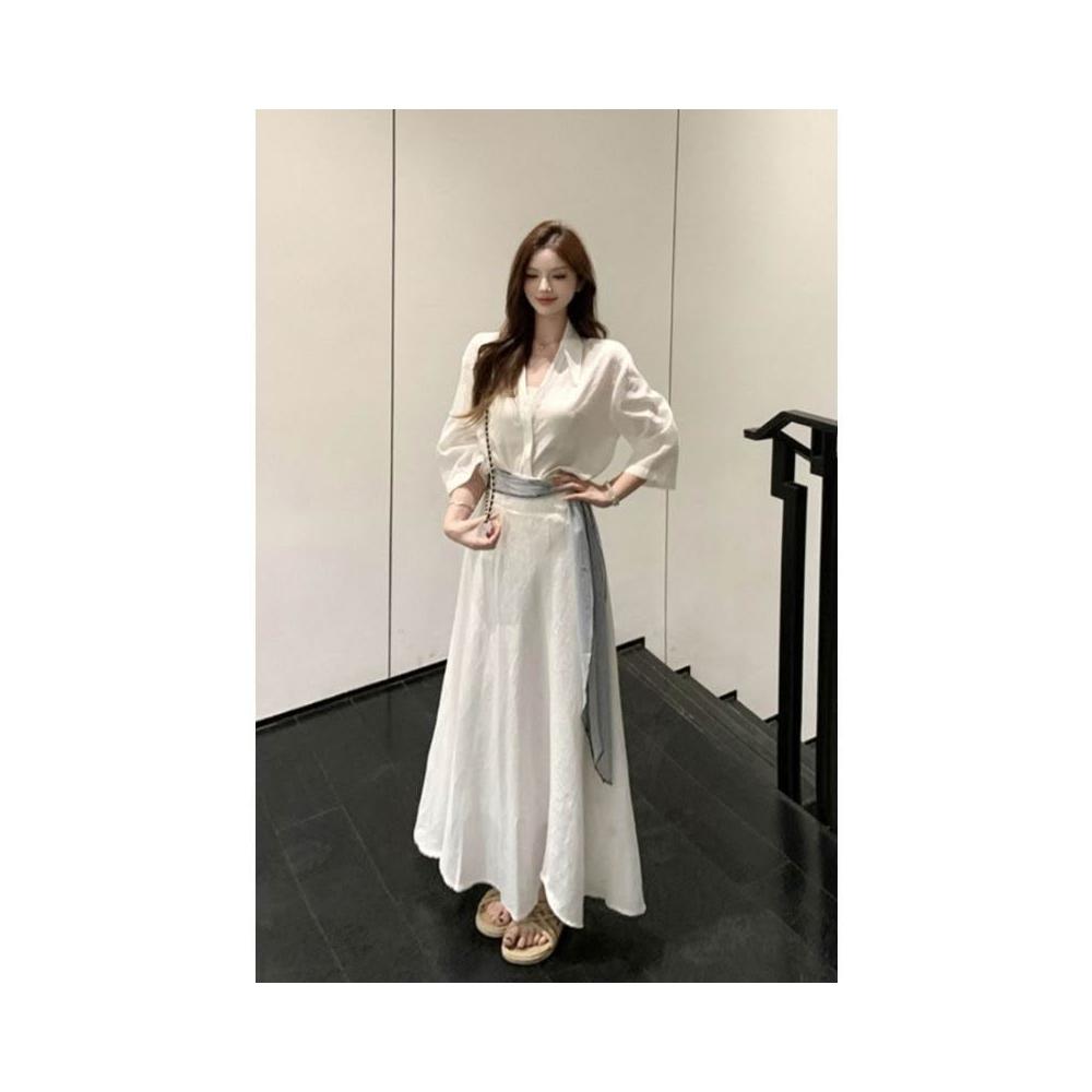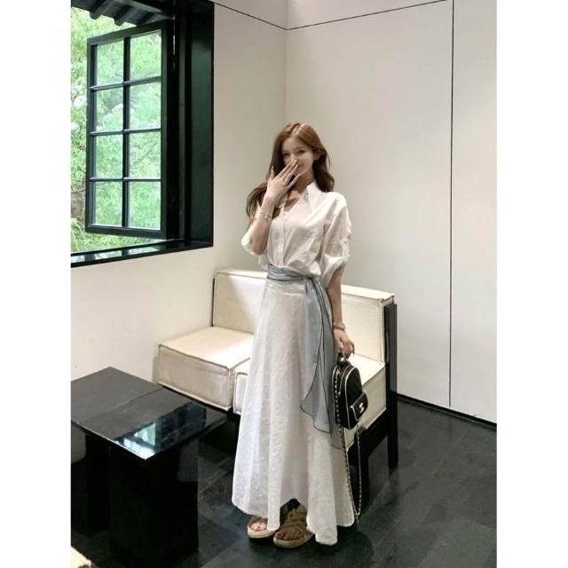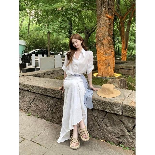 博博精品 氣質白色polo領 短袖襯衫上衣女 夏季時尚套裝高腰半身裙長裙兩件套 修身顯瘦 百搭舒適透氣 日常約會