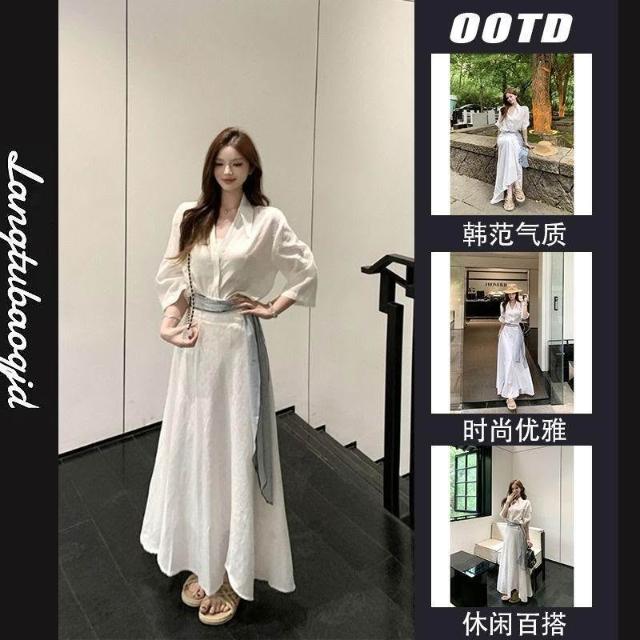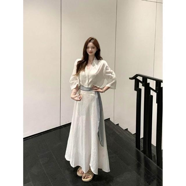 博博精品 氣質白色polo領 短袖襯衫上衣女 夏季時尚套裝高腰半身裙長裙兩件套 修身顯瘦 百搭舒適透氣 日常約會