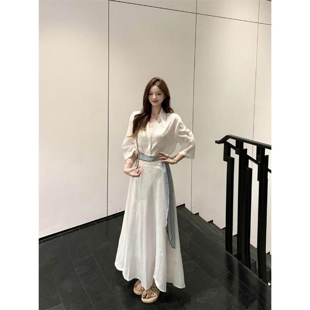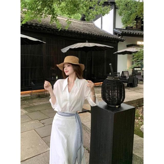 博博精品 氣質白色polo領 短袖襯衫上衣女 夏季時尚套裝高腰半身裙長裙兩件套 修身顯瘦 百搭舒適透氣 日常約會
