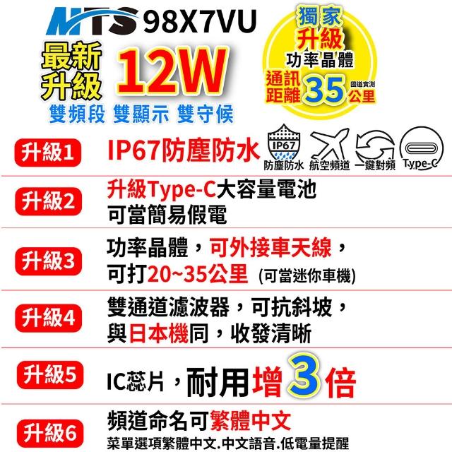 MTSMTS 98X7VU 升級新樣式天線 無線電對講機 12W大功率 IP67防水防塵 航空頻道