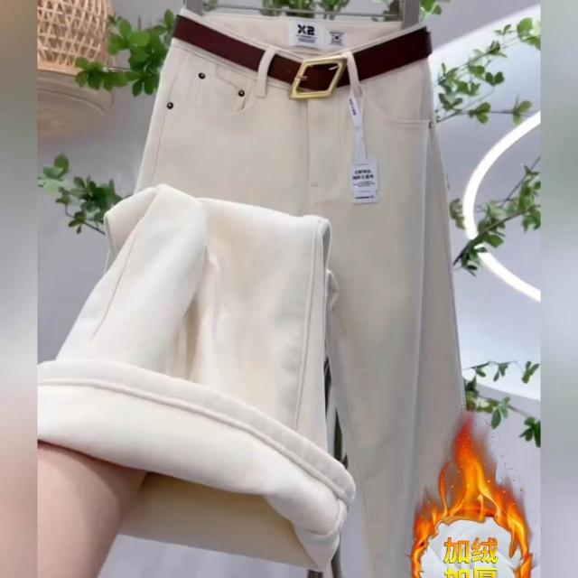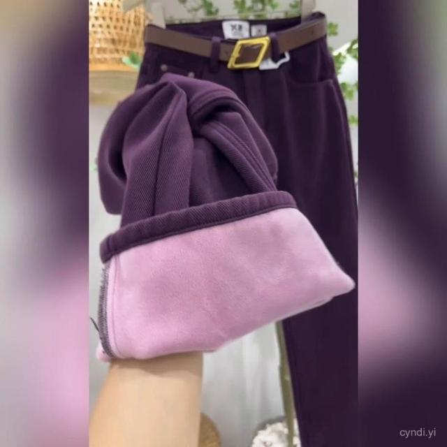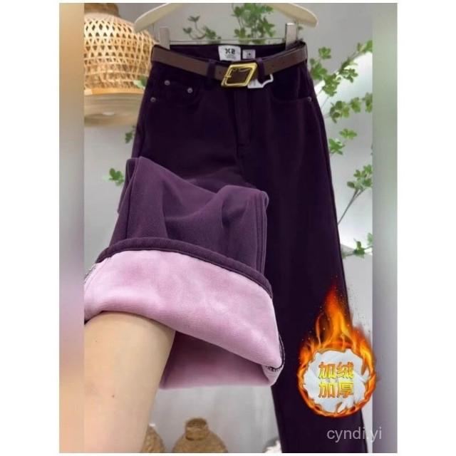 刷毛牛仔褲 葡萄紫加絨牛仔褲女高腰顯瘦25年新款冬季寬鬆梨型身材直筒褲子 加絨 刷毛褲 1009