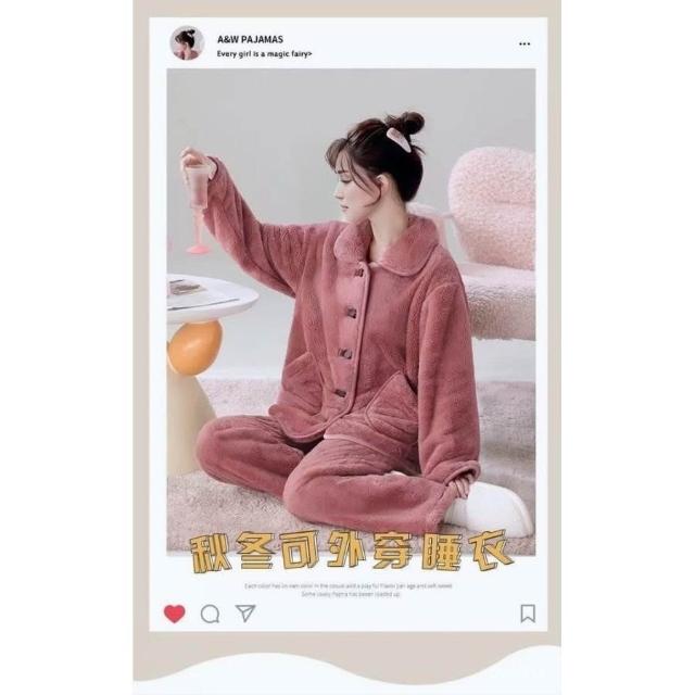 冬季加絨睡衣 雪花絨鎖溫保暖可外穿寬鬆睡衣家居服秋冬天加絨加厚女法蘭絨套裝 保暖 套裝1022 CIG5