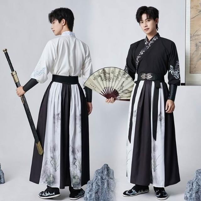 中式漢服 改良式古裝 改良漢服 原創魏晉刺繡黑色武俠交領霸氣漢服男黑色套裝成人中國風 表演服 漢元素 男裝 男漢服