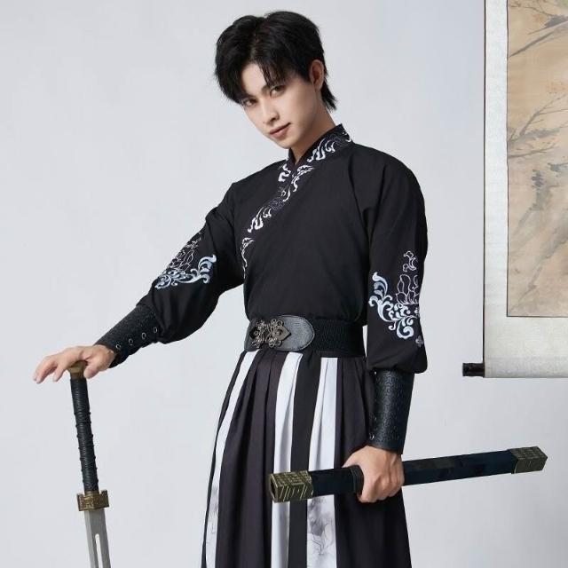 中式漢服 改良式古裝 改良漢服 原創魏晉刺繡黑色武俠交領霸氣漢服男黑色套裝成人中國風 表演服 漢元素 男裝 男漢服