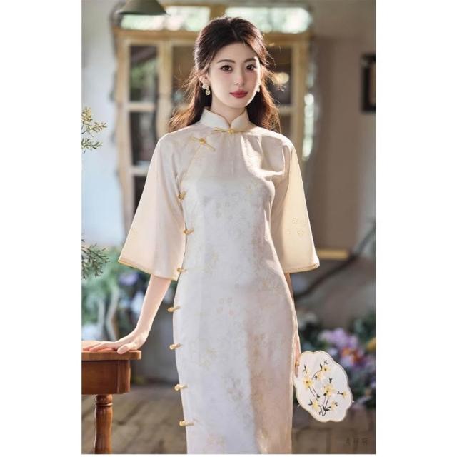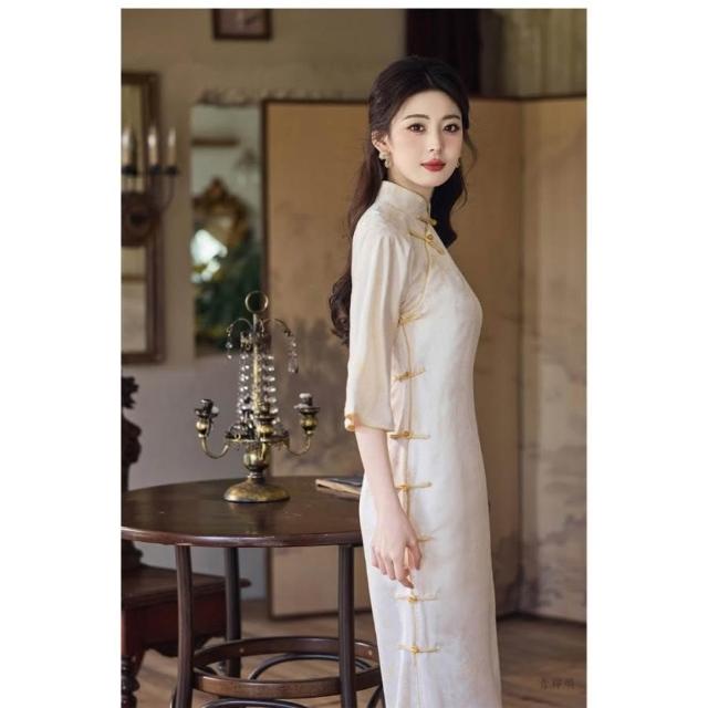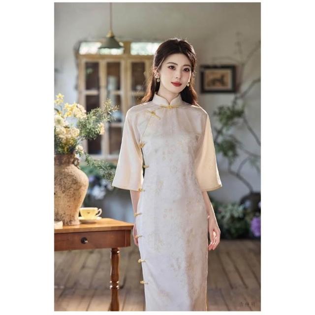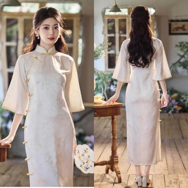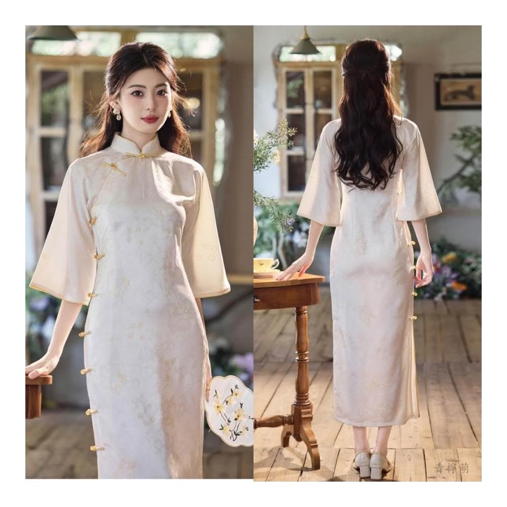 新中式改良旗袍 長袖旗袍 秋冬旗袍 中國風洋裝 溫柔風少女設計感連身裙表演服 倒大袖新中式連身裙款雅文藝清新少女日常旗袍